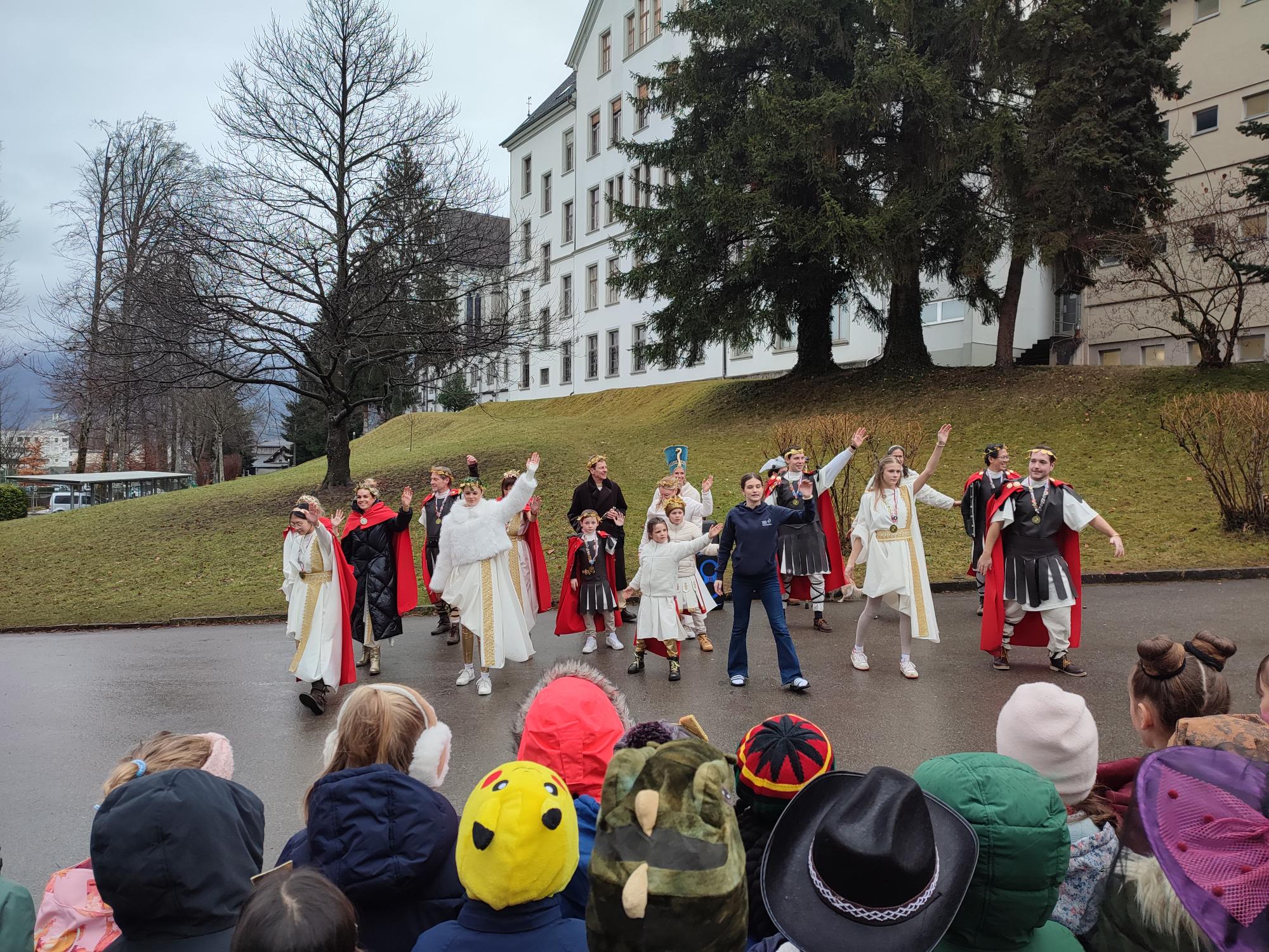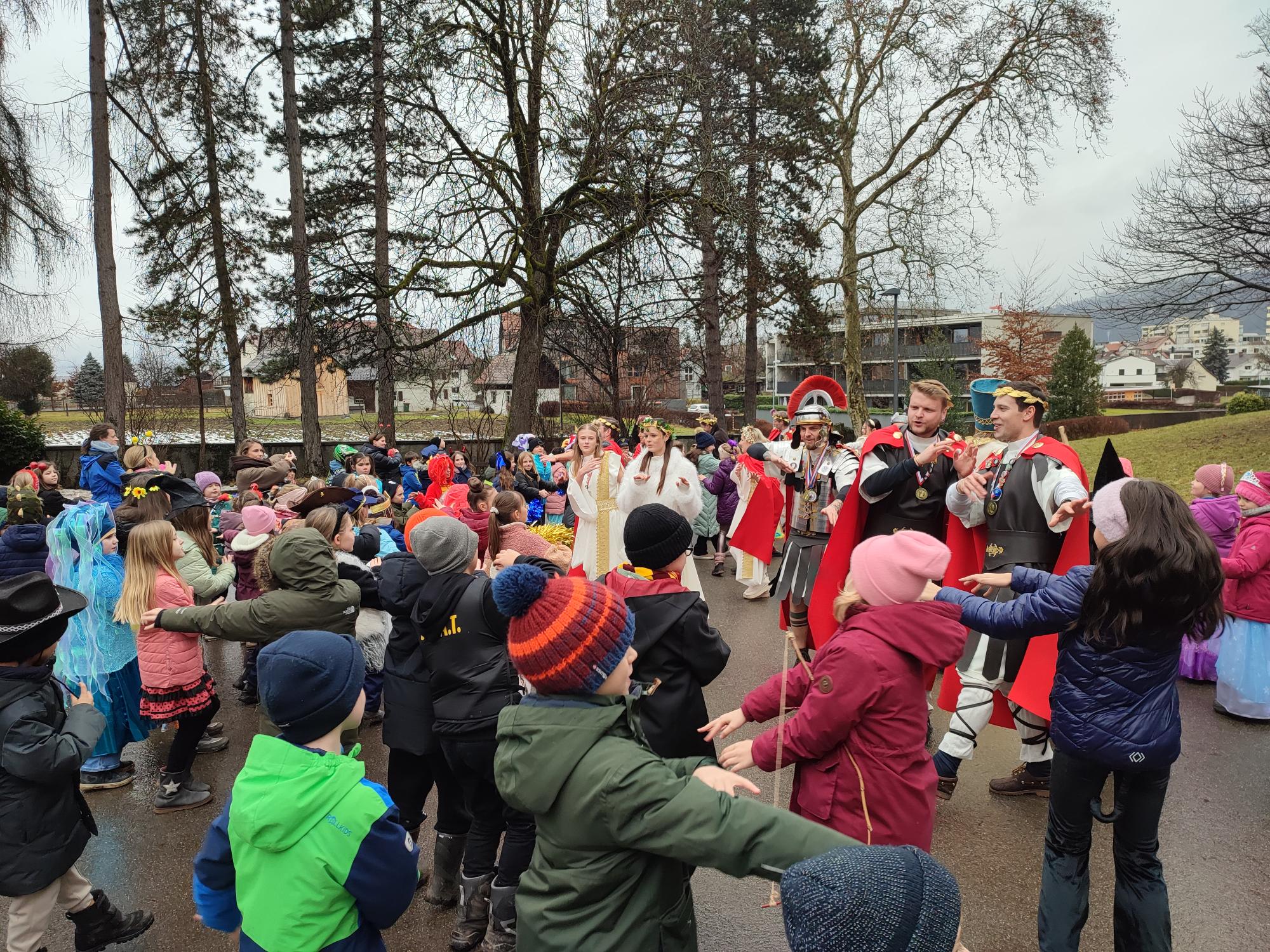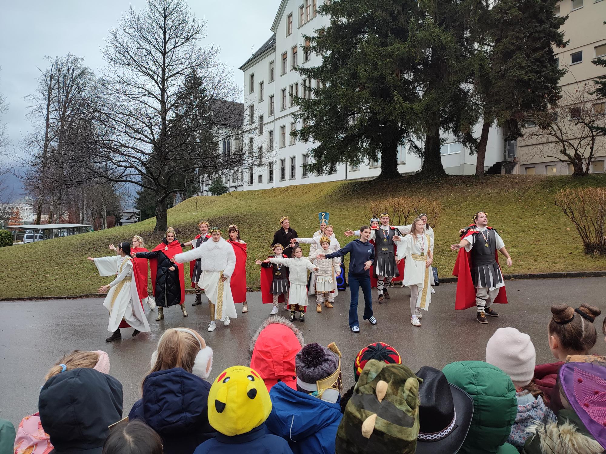 Heute bekam die Volksschule Riedenburg zur Freude der vielen „Mäschgerle“ Besuch vom Prinzenpaar inklusive Gefolge unter dem Thema „Römer“.