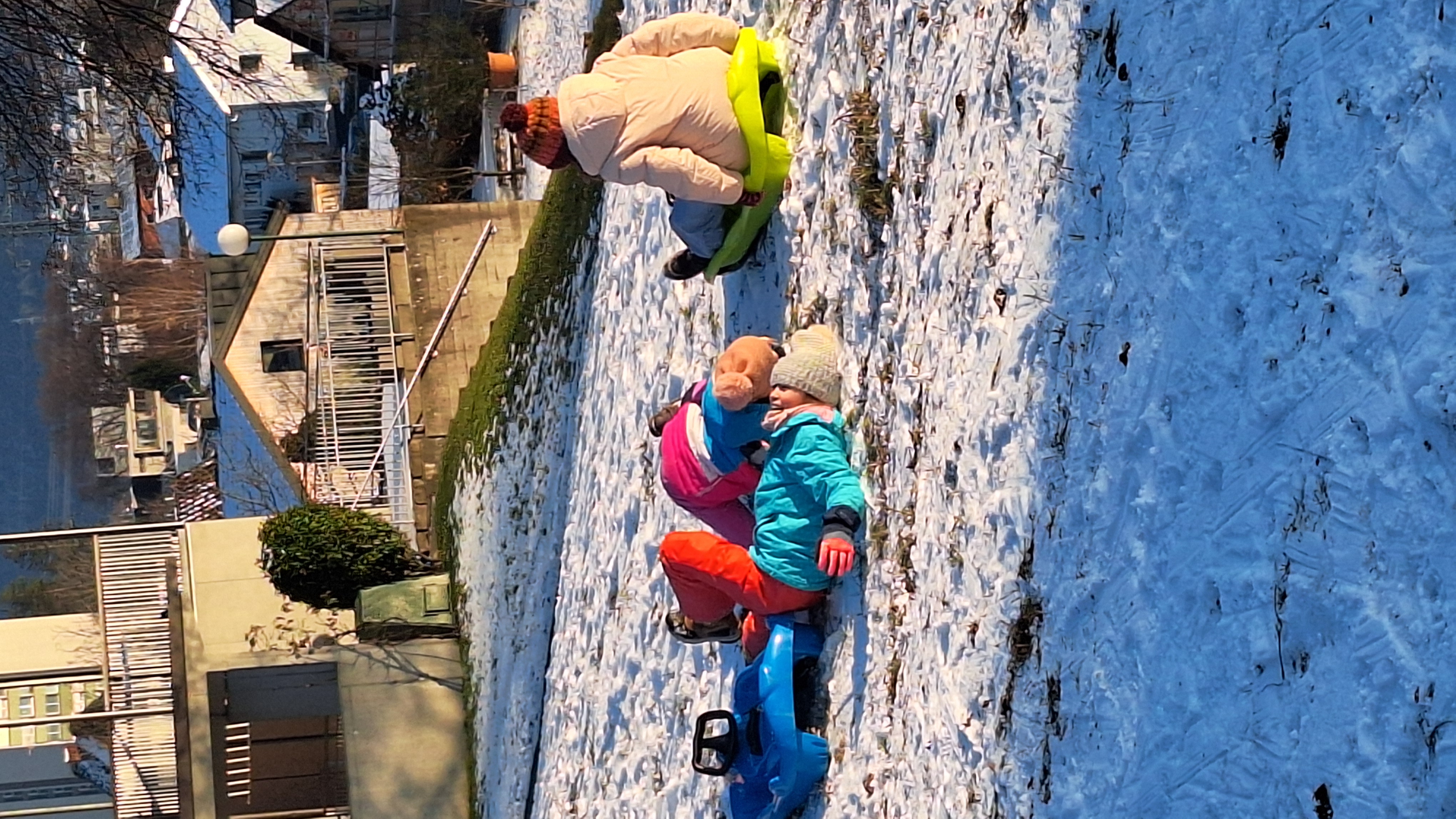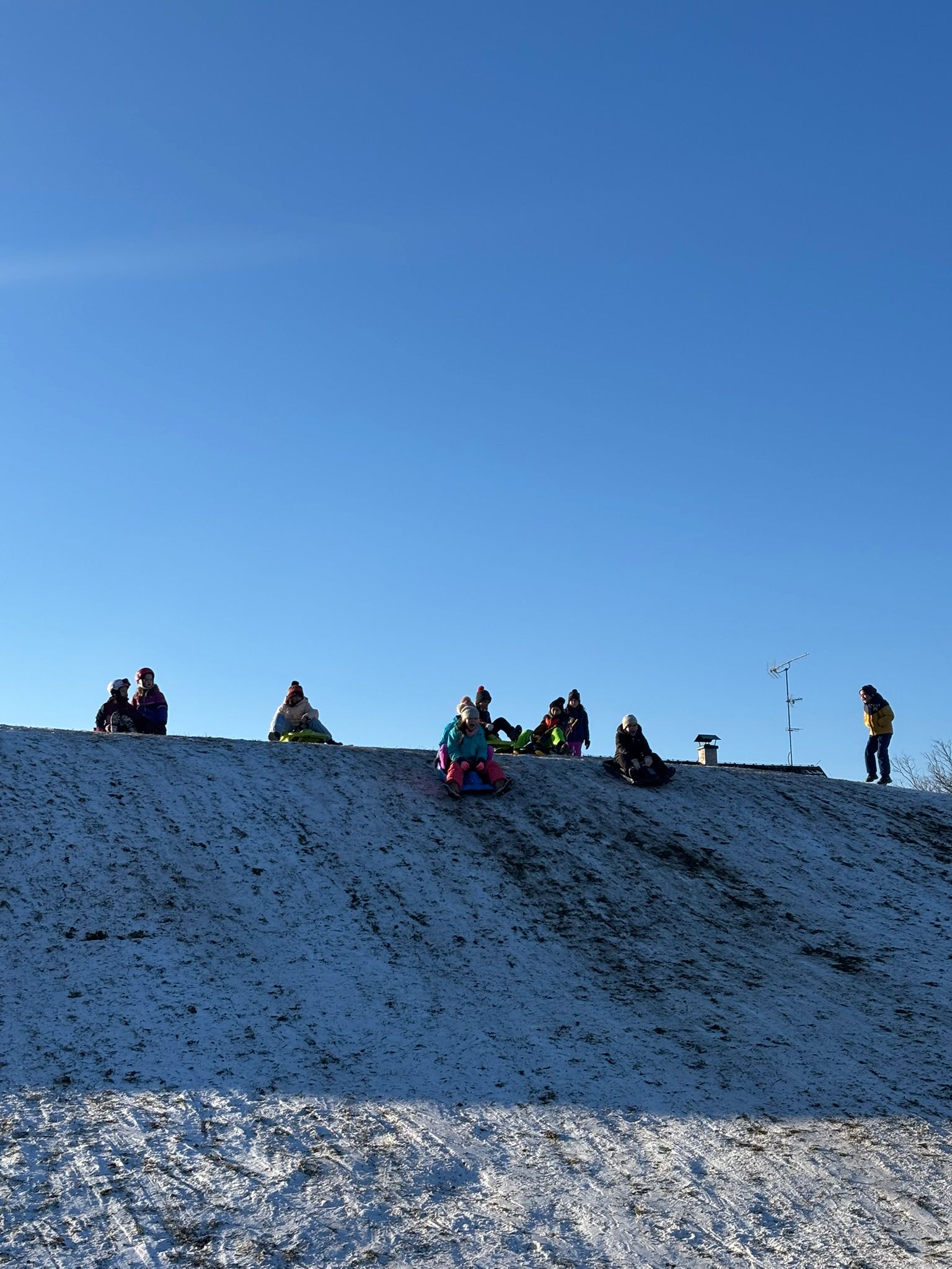 Mit Schlitten, Bobs und Rutschern ging es immer wieder den Hügel hinauf und mit viel Schwung hinunter. Dabei wurde viel gelacht und gejubelt. Einige Kinder versuchten kleine Wettrennen zu fahren, andere genossen einfach die Fahrt den Hügel hinab. Auch Stürze blieben nicht aus, doch sie endeten meist mit Lachen und guter Laune.